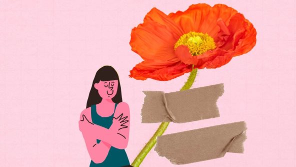 Ilustracija osobe koja samu sebe grli, na njoj je cveće i oko nje su leptiri.