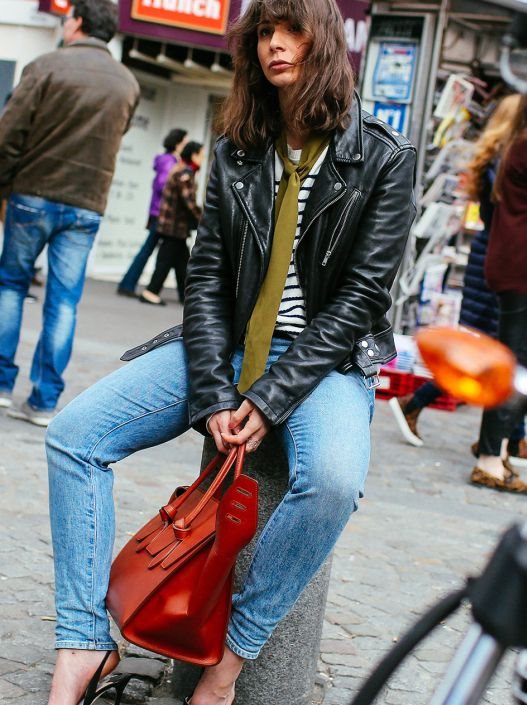 Ova koja nam je privukla pažnju je rezervisana za reviju koja se održavala u rano jutro a kako kaže Irina "rana jutra iziskuju chill, ležerne kombinacije". Srpska blogerka je na sjajan, ležeran način stilizovana večan model jeansa, Levis 501 sa elegantnim cipelama Jimmy Chooa, Saint Laurent bluzom na pruge i kožnom jaknom T by Alexander Wang. Kravatom u maslinastozelenoj boji Irina je sjajno finiširala ovaj ležeran, kul outfit koji je iznela sa razbarušenom kosom u stilu Jane Birkin, sve sa natapiranim šiškama.