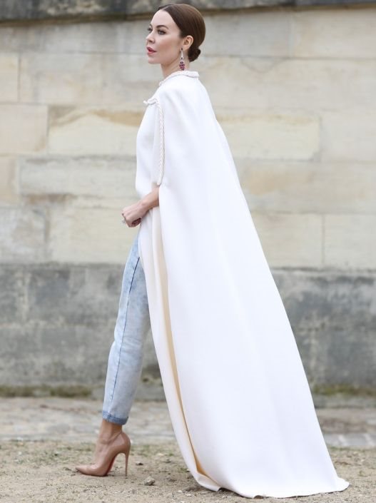 U stilu najvećeg profesionalca, Ulyana je svetlu denim kombinaciju (poluskinny, poluklasićan model jeansa 3/4 + košulja ) upravo stilizovala elegantnim, statement maksi ogrtačem (Balenciaga) u nežnoj ružičastoj boji koji je njenom izgledu doneo dramatičnost i onu retro modu kojoj je Ulyana verna u svakoj kombinaciji. Nismo mogli a da ne primetimo i nakit (Lizzie Fortunato) kao i prefinjeni model salonki Paula Andrewa u sličnoj boji ogrtača.