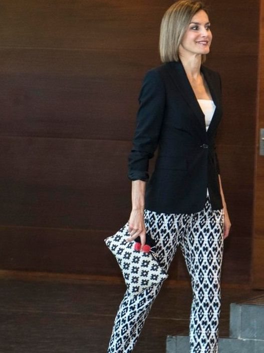 Jer, bilo je evidentno da si i ovde kalkulisala držeći se crno-bele palete. Naime, španska kraljica je belu majicu i crni blejzer nadogradila svilenim pantaloma u psihodeličnom crno-belom printu ali i statement sandalama i pismo tašni koja je imala takođe crno-beli desen samo malo drugačijeg grafičkog printa od pantalona.