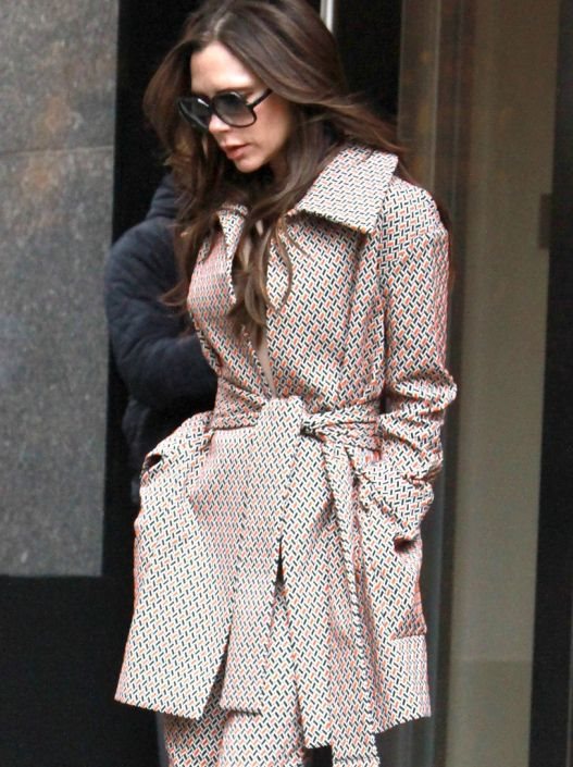 Beckham je kompletan, kordiniran look bazirala na savršeno polustrukiranim uzanim pantalonama, majici i kaputu bledoružičaste boje koje krasi minijaturni narandžasto-crni desen. Cela kombinacija je imala neku notu šezdesetih, ali je izgledala krajnje sveže i moderno. Savršen chic dodatak su bile crne salonke od prevrnute kože.