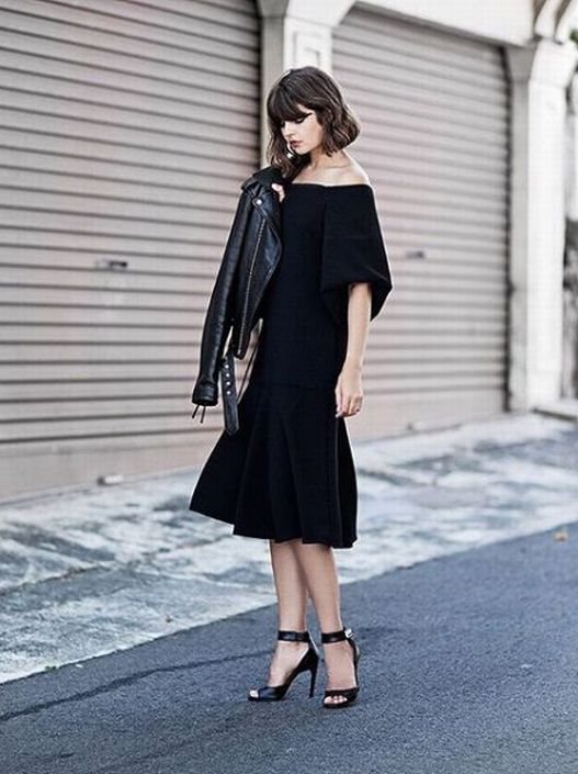 #Look 5: Ako se dvoumite šta da obučete uveče, kožna moto jakna i klasična midi haljina čine sigurnu kombinaciju, a odličan aksesoar za ovu kombinaciju su sandale na štiklu sa kaišem.