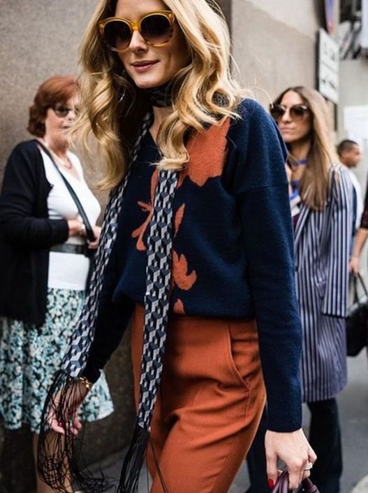 Svilenkaste dugačke pantalone nas podsećaju na vesele sedamdesete, a Olivia je ovaj fantastičan odevni komad u trendi cigla boji osvežila teget džemperom koji poseduje upečatljivu aplikaciju, u istoj boji. Poznata blogerka je nadogradila look efektnom maramom u kombinaciji plave, teget i crne boje, na beloj osnovi.