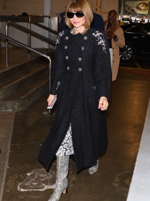 Ovoga puta Wintour se zaljubila u čizme koje kombinuje uz skoro sve moguće kombinacije. Na njujorškoj Marchesa reviji videli smo Annu kako šeta prelepe čizme od piton kože, do kolena sedeći u prvom redu. Malo smo istražili i shvatili da je ova čuvena urednica svoje čizme obukla na nekoliko modnih događaja od Pariza do Milana.