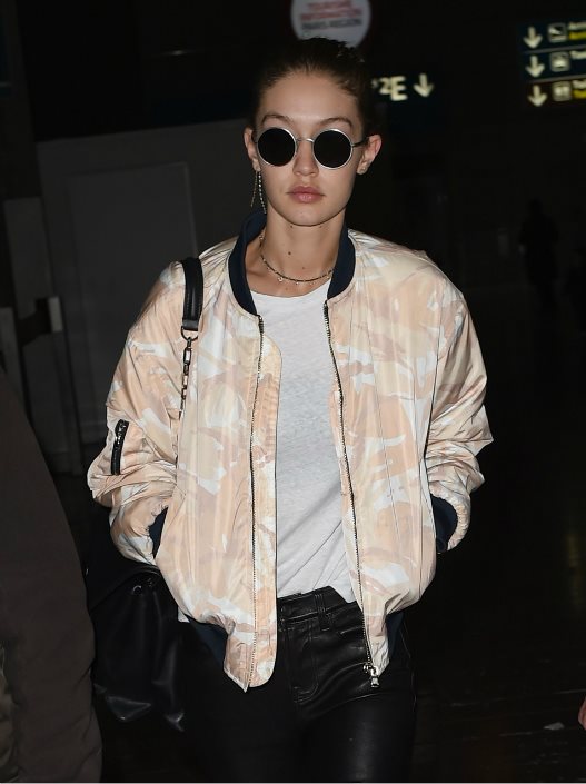 Gigi Hadid neguje mladalački izgled i sportsko-elegantan stil. Roze bomber jakna sjajno pristaje uz kožne pantalone i crne udobne patike.