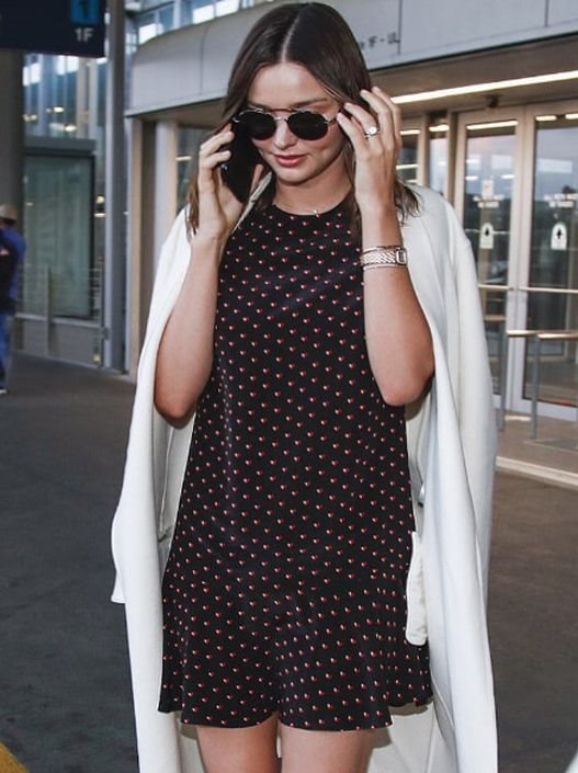 Simpatičnu tufnastu haljinu Miranda je ogrnula laganim mantilom bele boje koji je uparila sa belim patikama. Kombo je pravi izbor za duga putovanja, i to vrlo dobro zna 34-godišnja lepotica.