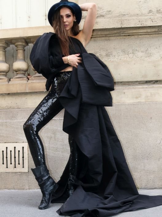 Top: Alexandre Vauthier / Pantalone: Saint Laurent / Čizme: Maje / Šešir: Maison Michel / Minđuše: Nadine Ghosn