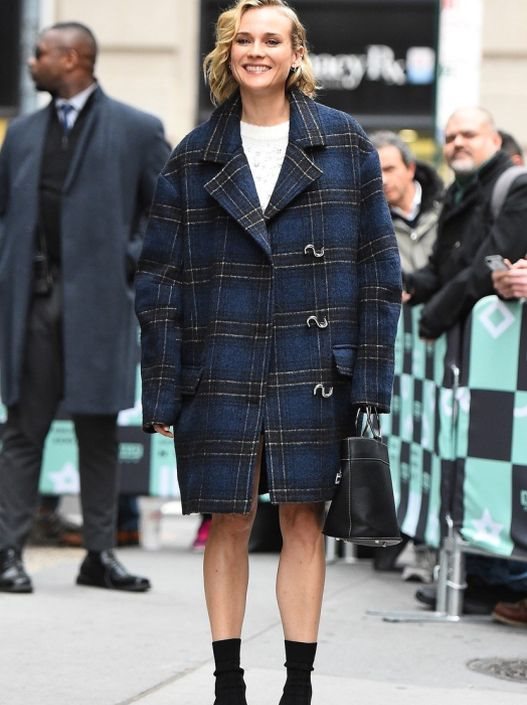 Diane smo zatekli u Njujorku gde je u ponedeljak prisustvovala američkoj premijeri filma. Za gostovanje u studiju Build Studio glumica je obukla pvc crnu suknju s ukrasnim rajsfešlusom i beličast, vuneni džemper krupnijeg pletiva.