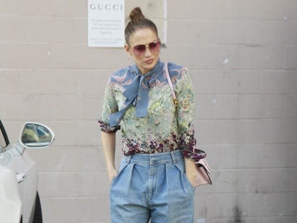 Umesto patika ili baletanki, ona je - pretpostavljate - odabrala Giuseppe Zanotti potpetice, i to je pun pogodak kada su u pitanju široki krojevi, kako ne biste izgledali niže ili krupnije. Dodatno pojačavajući glamur, JLo je farmerke spojila sa romantičnom Valentino bluzom, Celine naočarima i bež torbom.
