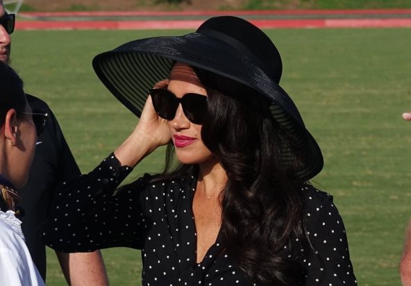 Meghan Markle za ovu je priliku odabrala elegantnu, ali praktičnu kombinaciju koju je vrlo lako nositi i izvan polo kluba, a nosiva je i u opuštenim, ali i formalnim prilikama. Crnu tačkastu bluzu uparila je sa širokim belim bermudama i u struku stegnula crnim pojasom, a dodatni dašak profinjenosti unela je omiljenim Aquazzura slingback cipelama, Valentino naočarima, velikim crnim šeširom, te crvenim ružem.