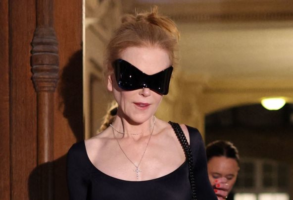 Uhvaćena ispred hotela u Parizu, 55-godišnja dobitnica Oskara bila je obučena od glave do pete u Balenciagu: u crnom topu dugih rukava sa širokim izrezom, svetloplavim širokim farmerkama visokog struka, i crnim parom čizama sa šiljastim vrhom. Iako ovo na prvu pomisao zvuči vrlo jednostavno, Nicole je ovu modnu kombinaciju dopunila dramatično velikim naočarima (koje je nosila i Kim), te crnom prošivenom kožnom torbom Hourglass XS.