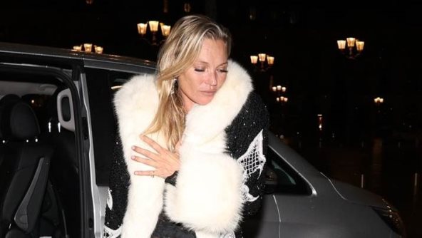 Naime, Kate Moss je nosila je dramatičnu čipkanu haljinu koja je otkrivala kožu, a kombinovala ju je sa satenskim dvobojnim ogrtačem sa ivicom od perja. Dijamantne narukvice i minđuše učinile su kombinaciju još zanimljivijom. Look je zaokružen parom srebrnih sandala sa tankim kaišićima, messy frizurom, te minimalnim make-upom.