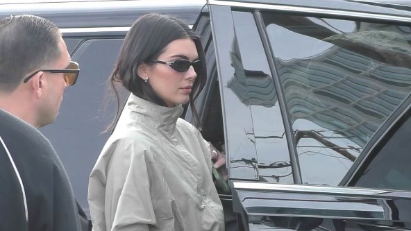 Jenner je tokom proteklog vikenda u San Francisku, u kom je boravila povodom Super Bowla, prošetala crne kapri helanke stilizovane na najmoderniji način za 2026. godinu. Umesto ležerne varijante sa majicom i patikama, Kendall se odlučila za japanke sa visokom stiletto potpeticom i ponela jedan od najvećih trendova godine do sada: sportsku jaknu sa podignutom funnel-neck kragnom.