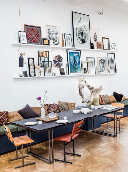 Boje su zemljane, zagasite... sve nijanse smeđe, cigle, zatim uvek otmena i zavodljiva maslinastozelena, golubijeplava... Kompletan prostor poseduje savršen balans momačkog stana gde imate utisak da se istovremeno osećate kao da se nalazite u industrijskoj zoni i cozy apartmanu....
