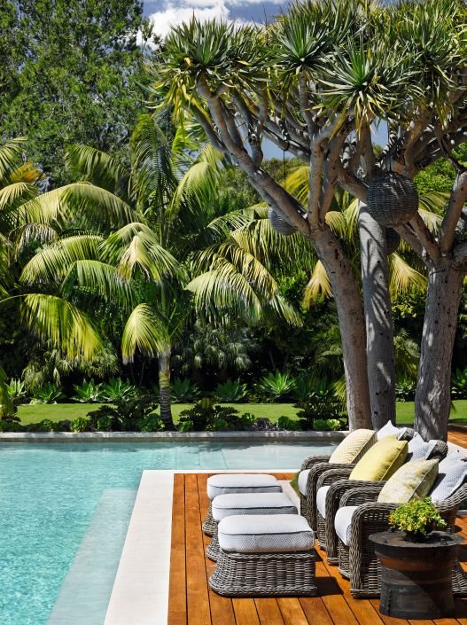 Mnogi komadi za ovaj projekat napravljeni su po porudžbini. Ovo se posebno odnosi na nameštaj u vrtu i pored bazena. Bullard je poznat po svojoj liniji tekstila za enterijer, pa su zidovi trpezarije obloženi batik tkaninom sa njegovim potpisom. Njom je postignuta savršena ravnoteža duha opuštene kuće na plaži i elegancije. Većina korišćenih tkanina je prirodna, poput pamuka i lana. Ceo jedan zid prekriven je jutom dok su u svim sobama postavljeni mali tepisi sa afričkim motivima, rađeni po porudžbini.