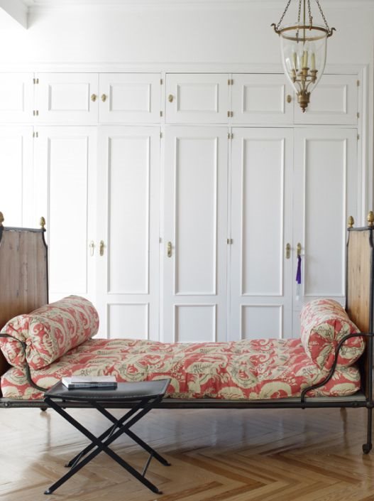 Crveno-beli mebl je delo kuće Bennison Fabrics dok je dekorativni tekstil koji je iskorišćen za sofu sa okvirom delo Gastona y Daniele. Pored vintage sofe, dnevni boravak je obogaćen i jednom venecijanskom stolicom na ljuljanje. Zidovi su ili okrečeni u belu boju ili prekriveni otmenim tapetama koje dodatno krase ogromna platna pejzaža naslikanih u akvarelu. Skoro svaka prostorija je prepuna knjiga, unikatnih, neobičnih ogledala koje krase vintage i orijentalni detalji.