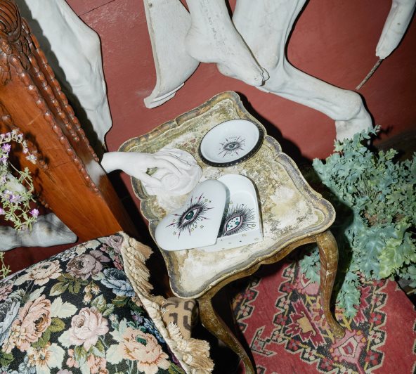 Celokupna ponuda je ekscentrična oda zabavi i pruža vam sve što vam treba za jednu raskošnu večeru u dvorcu. Njihovo posuđe, od poslužavnika za torte do posuda za šećer, izrađuje firentinski keramički brend Ginori 1735. Pažljivo urađen herbarijumski print ili serija motiva kuće, poput njihovog nadrealističnog ’Zvezdanog oka’ jeste otelotvorenje Gucci stila, dok novi setovi viljuški i kašika dolaze sa isklesanim lavovskim glavama, čiji proces izrade prolazi kroz 20 proizvodnih faza. Tu su i jastuci sa ružičastim cvećem i resama - sve se graniči sa kičem, ali ostaje u granicama stylish maksimalizma.