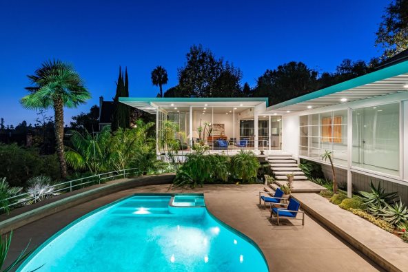 Kuća je izgrađena 1960. i mesto je koje odaje počast eri u kojoj je izgrađena, kako samim izgledom, tako i s brojnim retro detaljima kao što su terrazzo podovi i plafoni s gredama. Velike staklene stene pružaju obilje prirodnog svetla, te pogled na bujno zelenilo koje okružuje imanje. Kuća u obliku slova L prostire se na 200 kvadratnih metara, ima tri spavaće sobe, a sve imaju tepihe upečatljive kobaltno plave boje, koja se provlači kroz brojne detalje unutar enterijera i eksterijera vile.