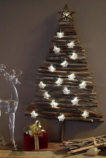 Poređajte štapove od najvećeg ka najmanjem, uvežite ih u obliku jelke i dekorišite svetiljkama. Detaljan postupak, koji se sastoji od samo nekoliko koraka, pogledajte u videu.