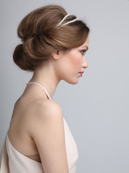 3. Potom na glavu stavite tračice (od nakita ili tkanine) koje će biti osnova oko koje ćete motati ostatke, odnosno donji deo kose. Svaki pramen blago natapirajte i smotajte ka unutra, vodeći računa da se krajevi ne vide.