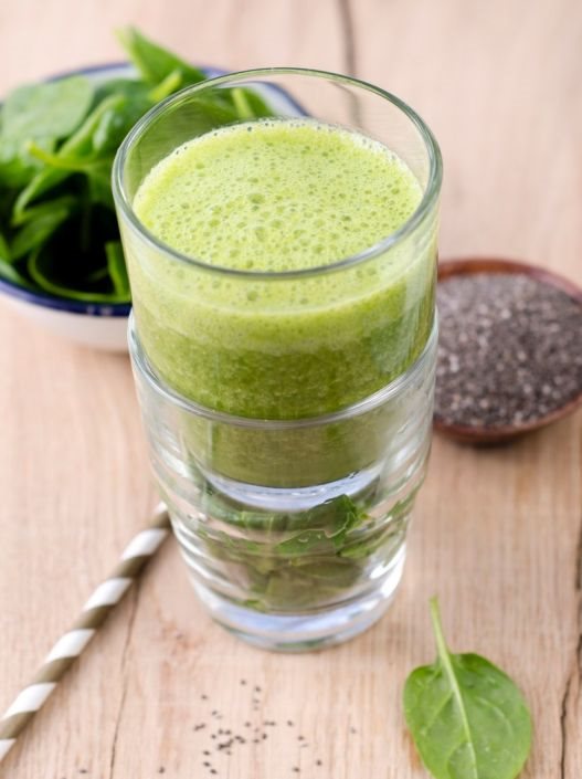 Kao bazu koristite pola litre soka od jabuke. Dodajte dve šake mladog spanača, opranog i odrezanih peteljki, dve kašike lešnika, jednu bananu, čajnu kašiku Matcha praha i jednu malu kašičicu chia semenki. Možete dodati i par kapi stevie ili cimeta da biste pojačali ukus. Popijte ga kao blagu zamenu za kafu.