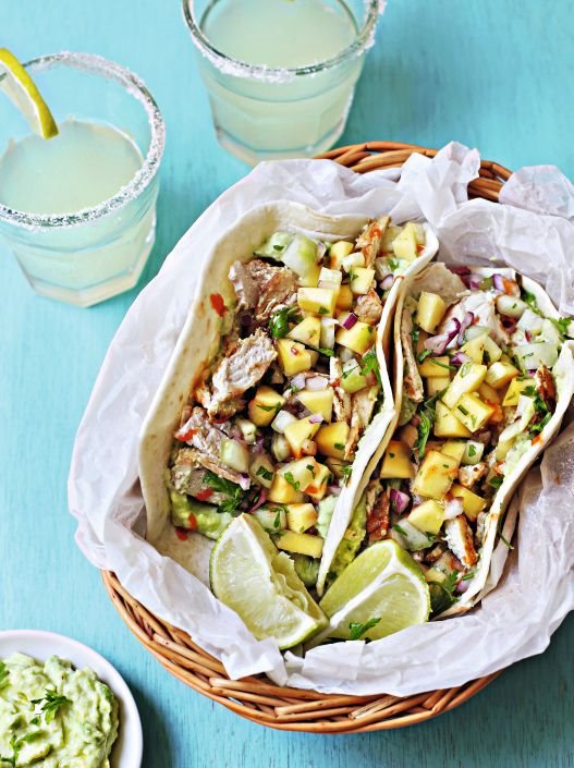 Tortilje kratko zagrejte na roštilju ili tiganju. Premažite avokado kremom, stavite meso, pa salsu od manga. Po želji, dodajte malo ljutog sosa tipa Tabasco. Služite odmah.