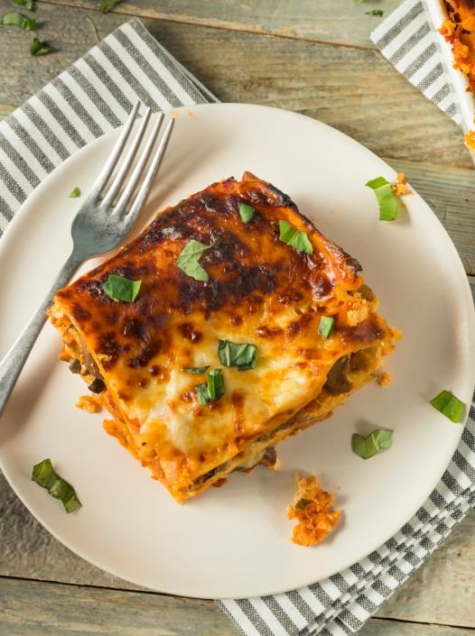 Izvadite povrće iz rerne i dodajte u veliki tiganj sa pelatom. U to dodajte i spanać i kuvajte još nekih 3 minuta. Posolite i pobiberite. U tepsiju stavite jedan sloj lazanja, pa preko trećinu smese sa povrćem, pa još jedan sloj lazanja. Preko toga sipajte još malo smese sa povrćem, pa onda sloj lazanje. Zatim prelijte sa sosom od sira i preko stavite ostatak smese od povrća. Prekrijte završnim slojem lazanja i onda ostatkom sosa od sira. Preko izrendajte još malo sira. Pecite 35-40 minuta tj. dok lazanje ne omekšaju ili dok preliv ne poprimi zlatno smeđu boju. Stavite 5 minuta pre sečenja da se punjenje slegne.