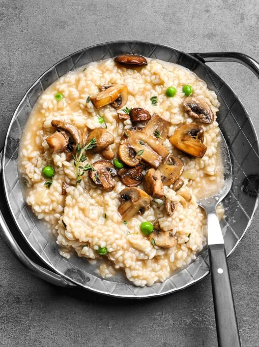 Smanjite toplotu i sipajte nekoliko kutlača toplog bujona (smesa vode i bujona) i kuvajte, lagano mešajući dok bujon ne upije. Nastavite da kuvate, dodajući nekoliko kutlača bujona svaki put kada pirinač upije. Tako kuvajte oko 20 minuta.