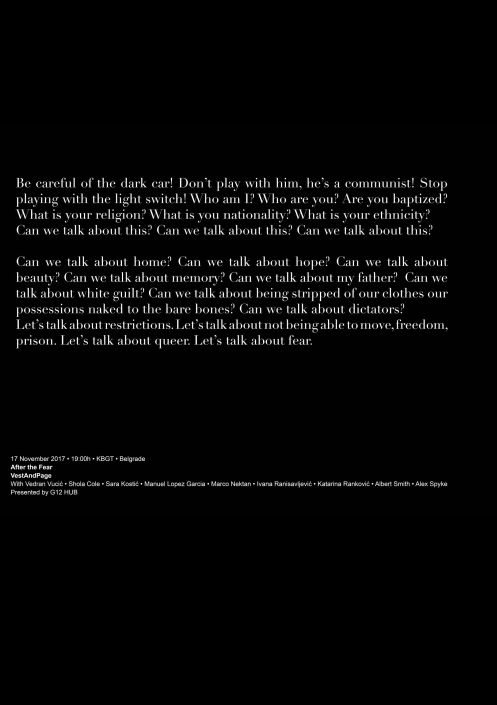Možemo li da pričamo o kući? Možemo li da pričam o nadi? Možemo li da pričamo o lepoti? Možemo li razgovarati o sećanju? Možemo li da pričamo o mom ocu? Možemo li govoriti o beloj krivici? Možemo li da pričamo o tome da smo ogoljeni odeće i profesije, goli do kosti? Možemo li razgovarati o diktatorima? Hajde da razgovaramo o ograničenjima. Hajde da razgovaramo o tome da ne možemo da se krećemo, slobodi, zatvoru. Hajde da pričamo o queer-u. Hajde da pričamo o strahu.