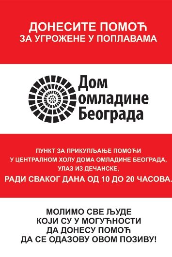 Svakog dana od 10 do 20 časova, u centralnom holu Doma omladine Beograda (ulaz iz Dečanske), otvoren punkt za prikupljanje pomoći. Trenutno su najpotrebnija sredstva za ličnu higijenu, šampon protiv vašaka, asepsol i dezinfekciona sredstva, suva i konzervisana hrana, hrana za bebe, mleko u prahu, pelene... Sve prikupljene stvari i namirnice, u koordinaciji sa službama Grada Beograda, dostavljaju se ugroženim građanima.