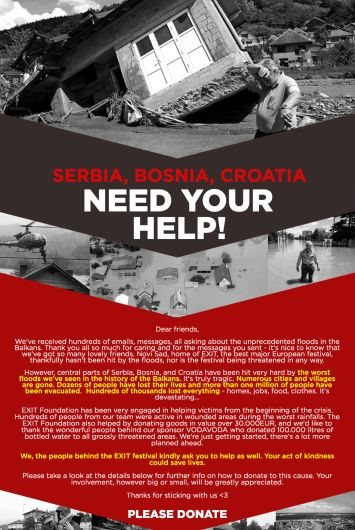 Asian Dub Foundation, zvezde Fusion bine su na svom zvaničnom Facebook profilu poslali svoju nesebičnu podršku, uz napomenu da je na Balkanu teška situacija i da su mnogi ostali bez doma, uz poziv svima koji mogu da učestvuju u pomoći.