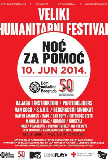 Dom omladine Beograda, MTV, Long Play i Crveni krst Srbije pozivaju publiku da u što većem broju poseti veliki humanitarni festival "NOĆ ZA POMOĆ", u utorak, 10. juna u Domu omladine Beograda. Sav prihod namenjen je građanima koji su ugroženi u nedavnim katastrofalnim poplavama. Ovaj festival ujedno će biti i prva od dve centralne manifestacije obeležavanja 50 godina Doma omladine Beograda.