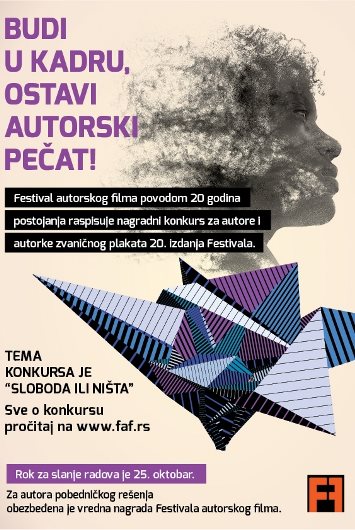 Konkurs „Sloboda ili ništa“ je otvoren do 25. oktobra. Kreativno rešenje plakata mora biti originalno, a pri izradi postera mogu se koristiti sve tehnike. Odluku o pobedničkom rešenju doneće žiri sastavljen od članova Saveta Festivala autorskog filma i art direktora agencije Executive Group. Ime autora/ke najuspešnijeg rešenja biće objavljeno 28. oktobra u 12h na FB stranama Festivala autorskog filma i Executive Group. Za autora/autorku najuspešnijeg plakata biće obezbeđen komplet ulaznica za sve projekcije na Festivalu autorskog filma, dok ComputerLand poklanja pobedniku konkursa grafičku tablu Wacom Intuos Pen.