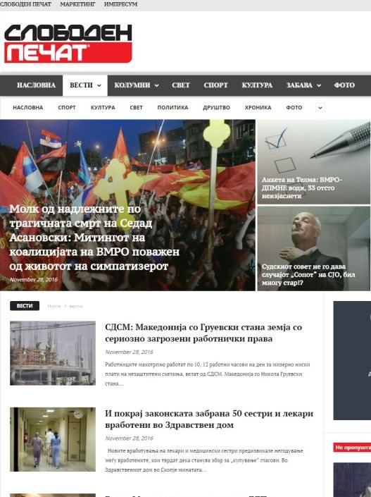 Osim najvažnijih vesti iz Makedonije, regiona i sveta, na portalu slobodenpecat.mk čitaoci će naći najnovije kolumne istaknutih ličnosti iz makedonskog javnog života, kao i najnovije vesti iz dijsapore, politike, kulture, sporta, društva i hronike.