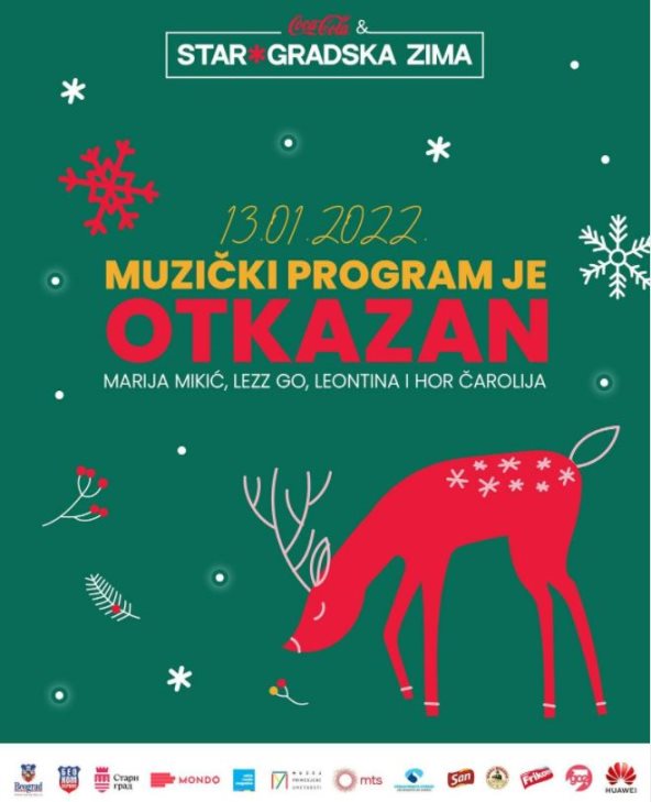 "Obaveštavamo sve Beograđane da se zbog novonastale nepovoljne epidemiološke situacije svi planirani koncerti u okviru Starogradske zime otkazuju. Sigurni smo da će biti prilike da u budućnosti uživamo u dobroj muzici i koncertima, ali u ovom trenutku su zdravlje i bezbednost na prvom mestu. Starogradska zima traje do 23. januara, a prateći i dečiji program biće održan u skladu sa vremenskim prilikama. Za detaljnije informacije o programu pratite sajt GO Stari grad kao i zvanične profile na društvenim mrežama", rekao nam je Radoslav Marjanović, predsednik opštine Stari grad.