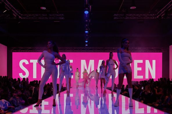 Prvi deo revije obeležili su modeli iz najnovije kolekcije koja slavi njujorške korene brenda: štikle u dramatičnim bojama ružičaste, neon zelene i narandžaste, uvek trendi mokasine, zavodljive čizme preko kolena u metalik nijansama i kultne booties koje su osvojile kupce od osnivanja brenda 1991. godine.