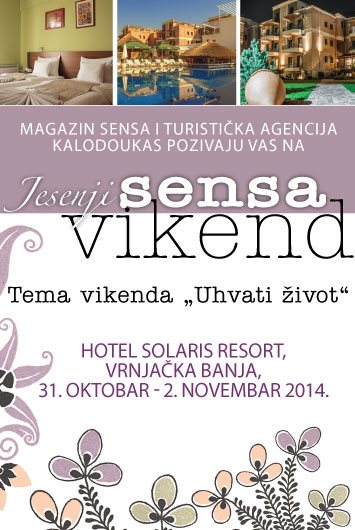 Jesenji Sensa vikend biće održan saradnji sa turističkom agencijom Kalodoukas, u Hotelu Solaris Resort, Vrnjačka Banja, 31. oktobar – 2. novembar 2014. Solaris Resort je nov i moderno opremljen objekat u turističkoj ponudi Vrnjačke Banje. Ambijent odiše komforom, prijatnošću i umetničkim šarmom koji goste neće ostaviti ravnodušnim.