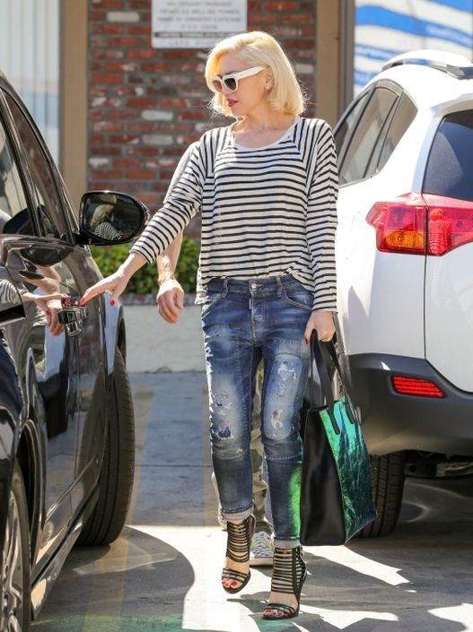 Gwen je izgledala retro ali moderno pojavivši se u boyfriend jeansu koji je uparila ležernom, širom majicom na pruge. Nadogradnja je bila u njenom stilu: retro, bele naočare za sunce, njena chic platinsta kosa u stilu pedesetih, ceger od pvc koji menja boju na suncu i sandale sa kaiščićima.