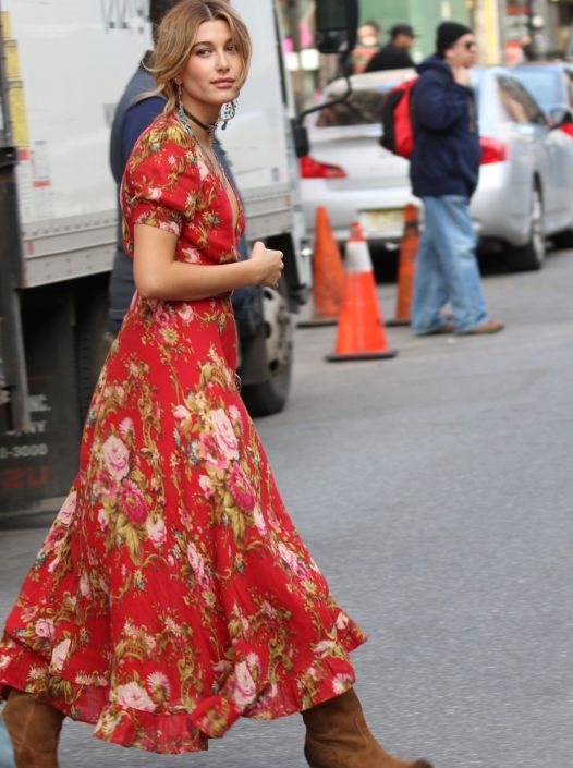 Kompletan look, Hailey je nadogradila fantastičnim camel čizmama od prevrnute kože u stilu kaubojki, pokazavši da je ova kombinacija uvek dobitna! I aksesoari su ispratili boho stil pa je Hailey finiširala stajling velikim i upečatljivim nakitom!