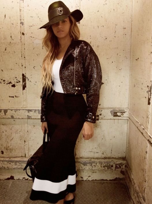 Za odlazak na poslovni sastanak ovoga puta Beyonce je izabrala "Interlock" pletenu crno-belu suknju iz nove prolećne kolekcije Victorije Beckham. Suknju je kombinovala uz minimalistički beli top, kratku kožnu bomber jaknu i šešir širokog oboda.