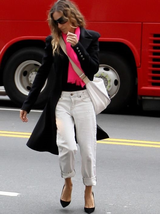 Njena kovrdžava kosa i ciklama ešarpa, kao i sunčane naočare i kožna bela torba koju je SJP nosila ukoso su finiširali ovaj dnevni look koji i vi možete da iskopirate u svojoj režiji.