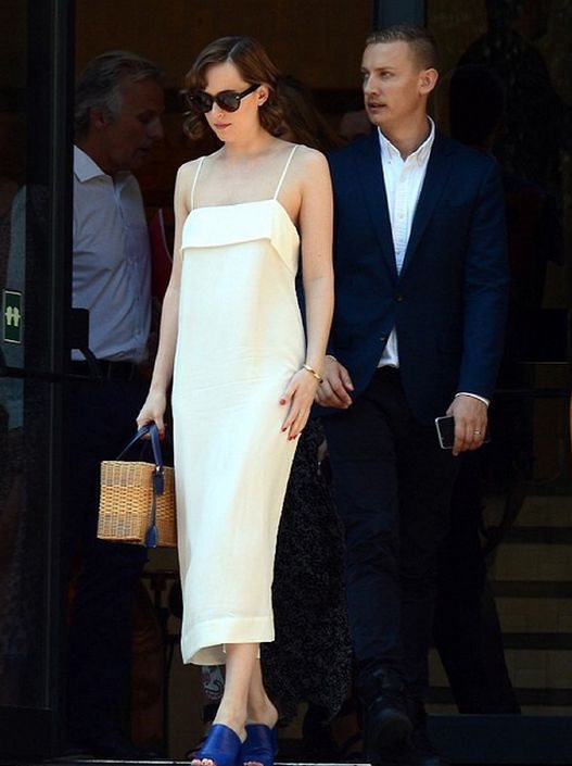 Naime, Dakotu smo videli na ulicama Njujorka u slip haljini, prijatne i letnje boje vanile /Apiece Apart) koju je glumica nadogradila torbom od plute u stilu Jane Birkin s potpisom Marka Crossa i savršenim kobalt plavim mules sandalama.