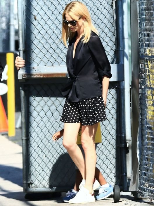 Charlize je za ovu priliku izabrala zabavnu i nonšalantnu kombinaciju u kojoj je izgledala kao devojčica! Naime, iako većina ljudi odbija leti da nosi crnu boju, Theron se pojavila u njujorškom studiju stilizovana u mini suknju nalik lambadi sa tufnicama koju je nadogradila crnim, svilenkastim kimonom i belim kožnim patikama. Sooo 50s!