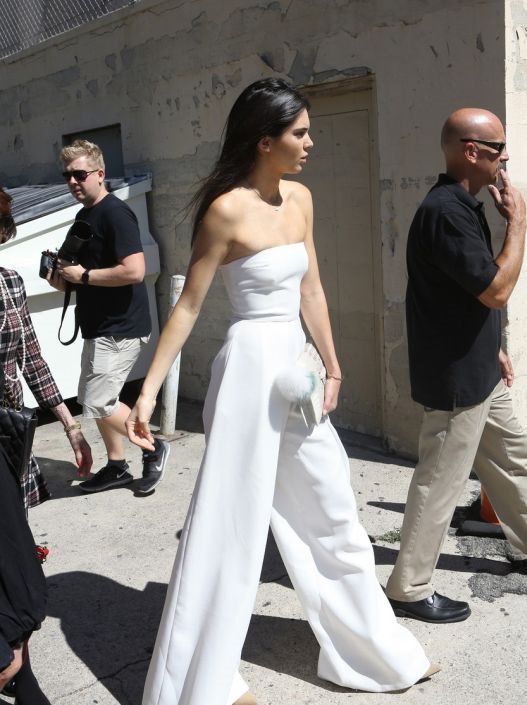 Za rođendanski brunch i prikazivanje "Fantoma u operi", koji je sa porodicom posetila, Kendall je odabrala beli kombinezon bez naramenica sa širokim nogavicama koje su joj prekrivale cipele, pa je na trenutke kombinezon delovao poput haljine.