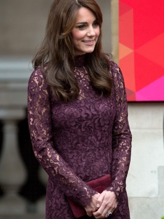 Uzanu haljinu, kratke kragne i midi dužine, 3/4 rukava delikatne, malo krupnije čipke, Kate je nadogradila salonkam u sličnijoj nijansi od prevrnute kože i pismo torbom u toj istoj boji.