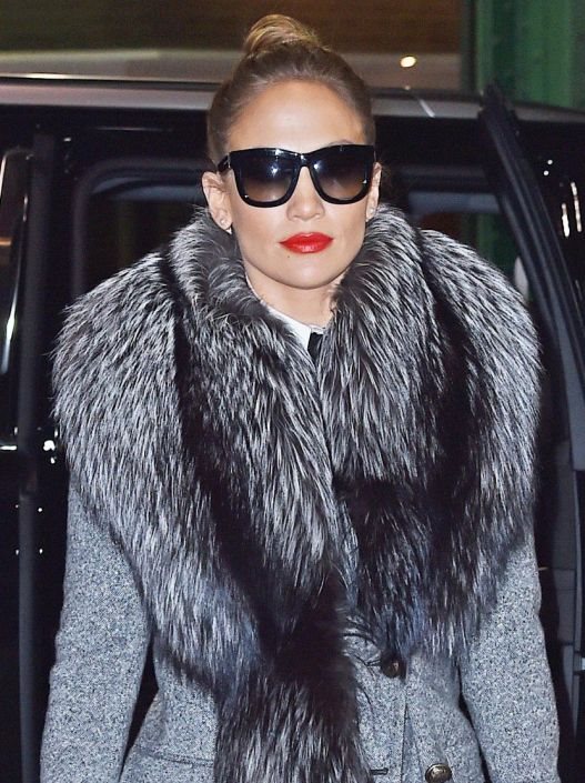 Fantastičan sivi kaput sa prošaranim ukrasnim krznom u kombinaciji sa visokim štiklama zaista izgleda fascinantno i glamurozno na njoj.