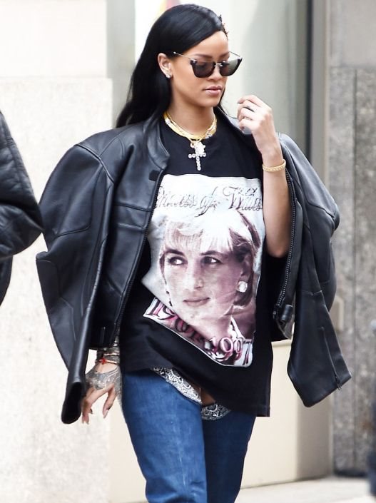 Reč je o teksas čizmama visine iznad bedra s kaišem iz limitirane kolekcije za Manolo Blahnik, koje je nadopunila širokom majicom s printom Lady Di, voluminoznom kožnom jaknom, minijaturnim teksas šorcem, zlatnim choker ogrlicama i kojom narukvicom.