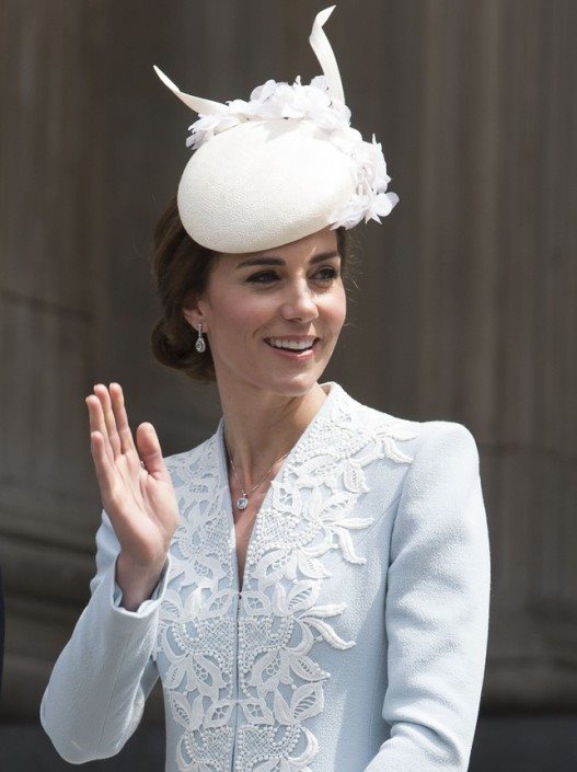 Na prvi pogled, to je i ovog puta bio slučaj. Kate se pojavila u svetlo plavoj Catherine Walker kostim haljini sa detaljima od čipke, belim šeširom i nude salonkama.