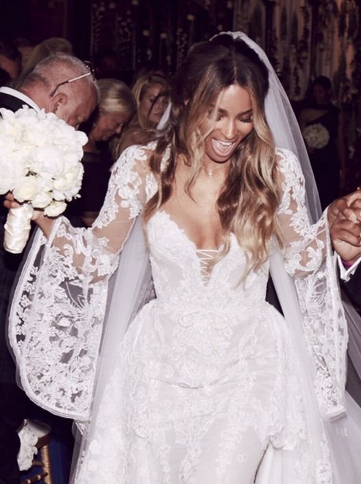 Ipak za verne fanove na društvenim mrežama vretenasta i seksi diva je objavila jednu fotku sa venčanja otkrivši da se udala u ručno rađenoj venčanici italijanskog dizajnera Roberta Cavallija koju su krasili romantični, zvonasti čipkasti rukavi i seksi korset kao i raskošna suknja.