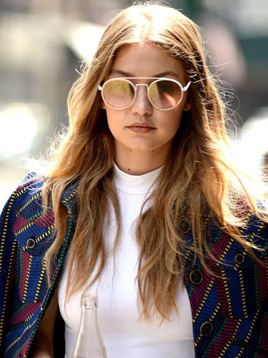 Ovo retro odelo je u njenim rukama postao veoma atraktivan komad, kada je Gigi uz njega uklopila beli crop top i futurističke patike koje su celoj kombinaciji dale kežual vajb.